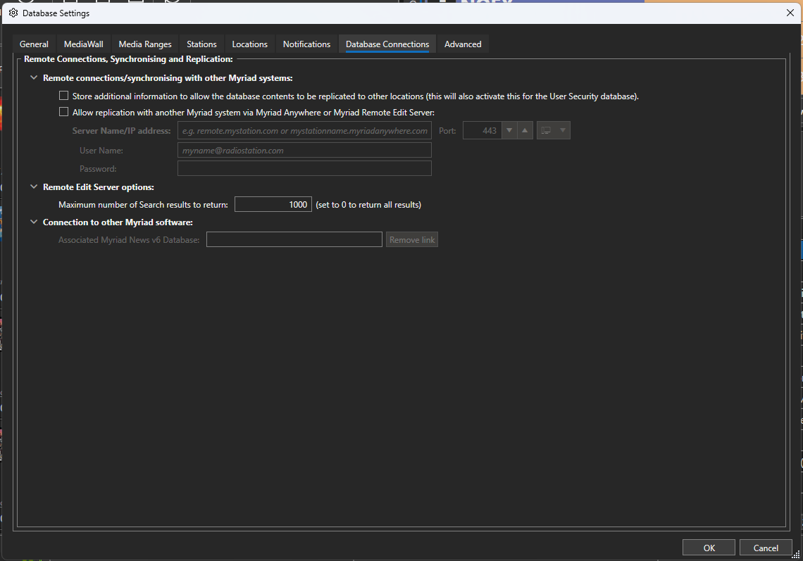 - First, setup Myriad 6 Playout to allow replication to another site. Click on Settings Menu > Database Settings > Database Connections tab.
