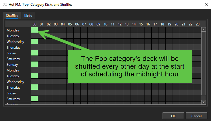 Myriad Schedule Plus users can also setup automatic Kicks and Shuffles from the button so it will automatically shuffle/kick items in the deck when it first schedules items for that hour. For example, you might shuffle your A-List deck at 3 am each morning to ensure that the order doesn't become too repetitive.