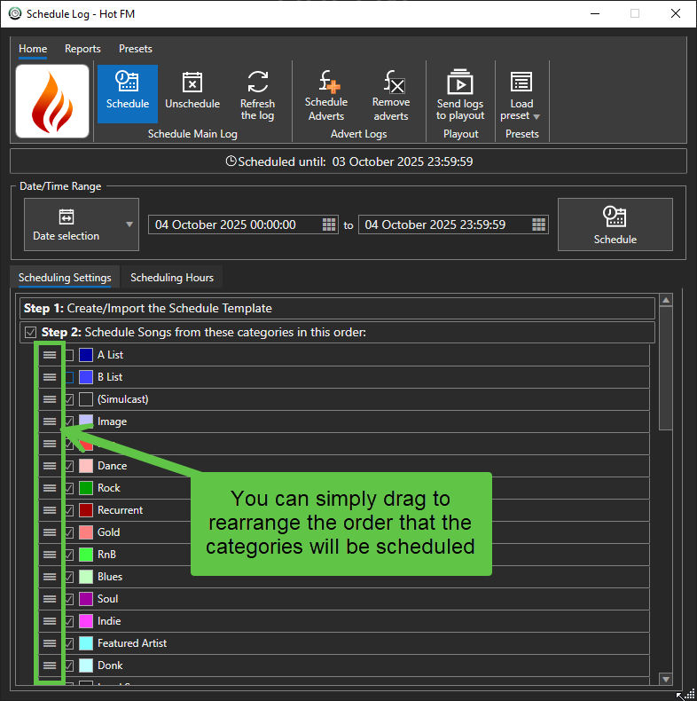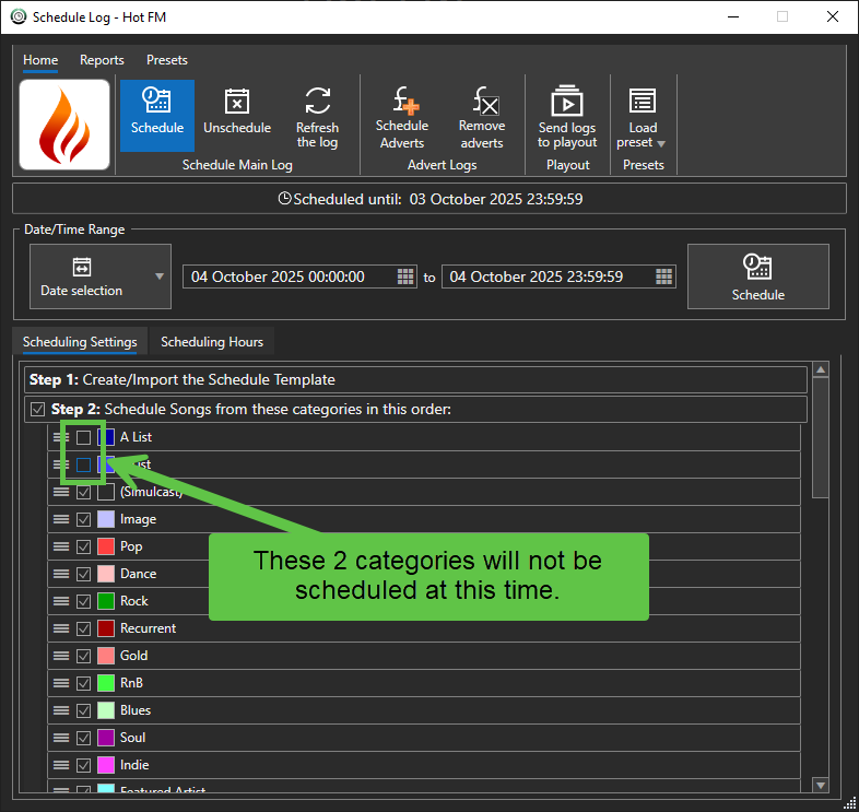 - Selective category scheduling: You can choose to only schedule some categories at a time, for example, you might want to pre-schedule longer periods of your log ahead of time with the major categories scheduled, but then only schedule your A and B List categories shortly before the hours are due to air.
