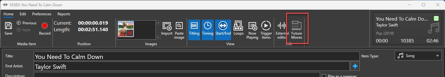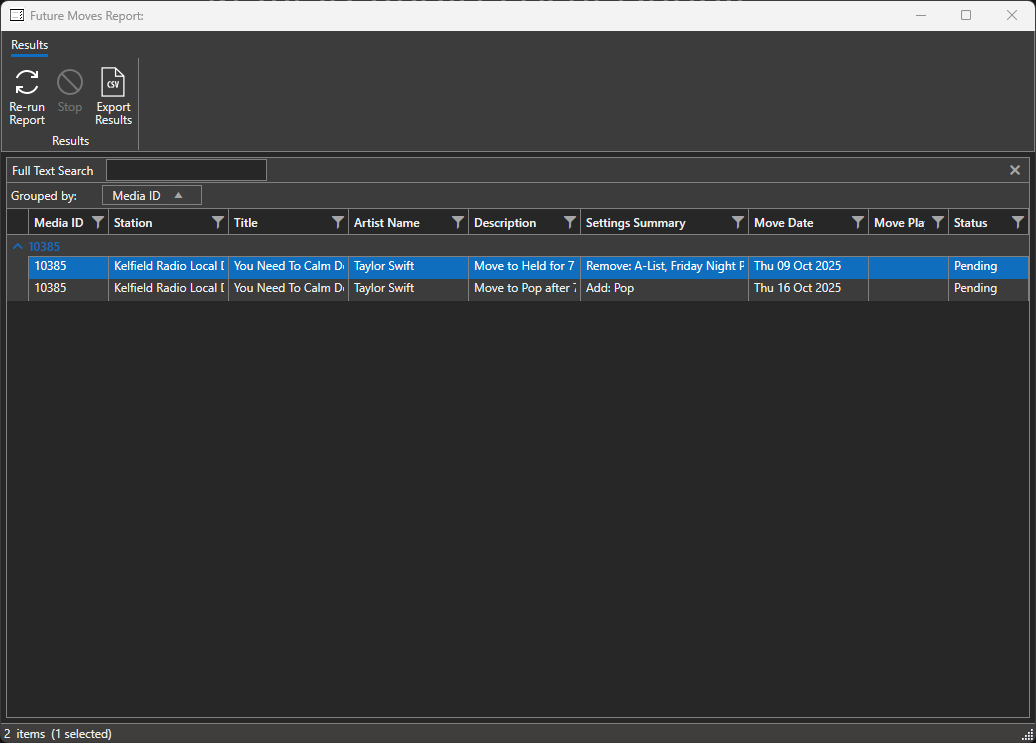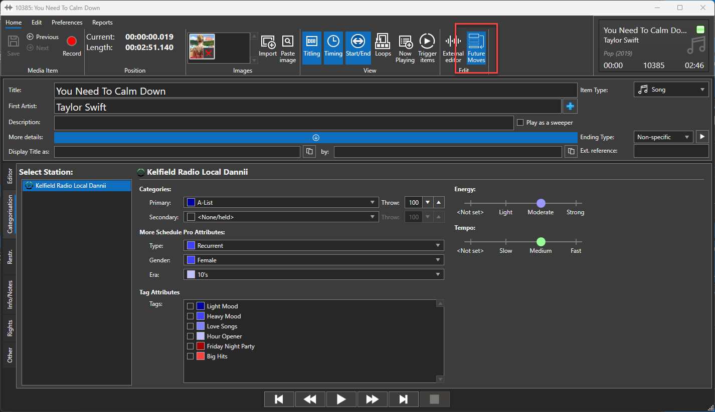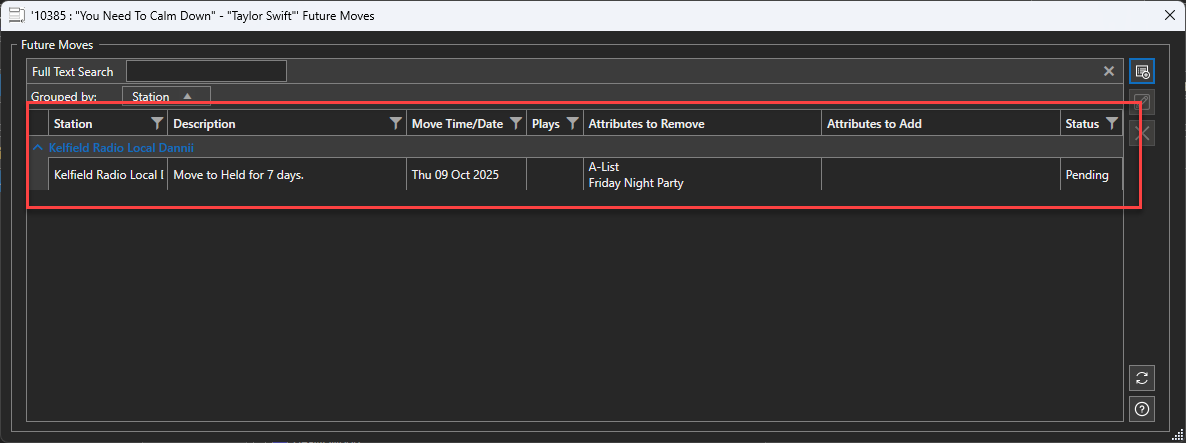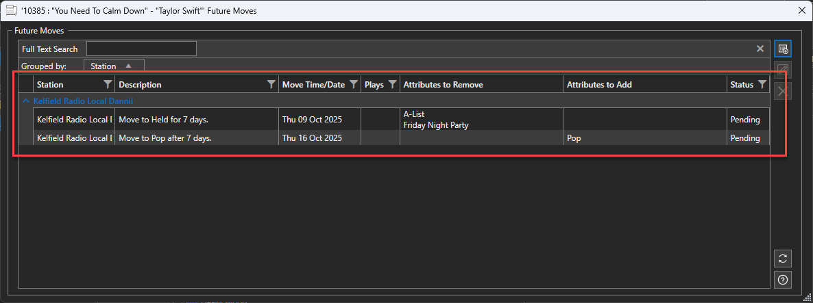 Without Future Moves, you would need to perform each of these steps manually, but Future Moves allows you to add these planned changes to the Song when you first add it to the system, and each step will be executed automatically when the criteria is met.
