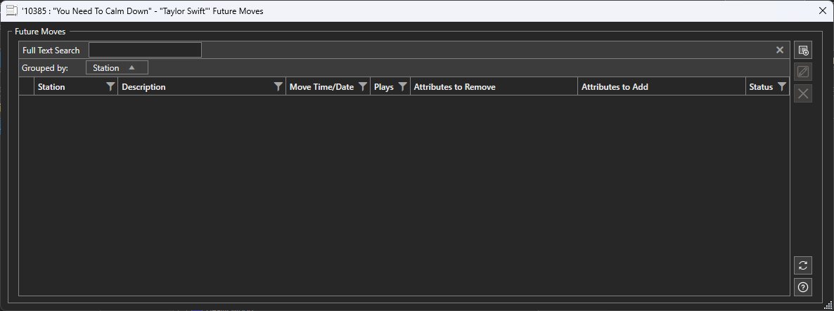 - This will open the Future Moves window for the Media Item. If there are any Future Moves defined already, they will be listed and can be edited as required. In this example there are no Future Moves planned for this Media Item.