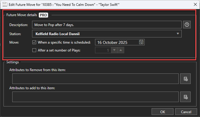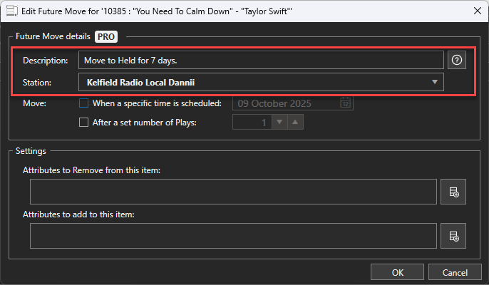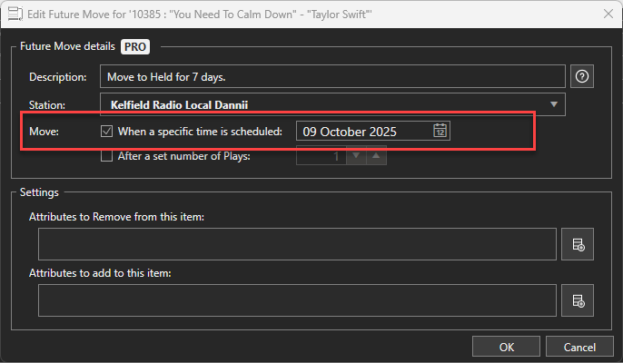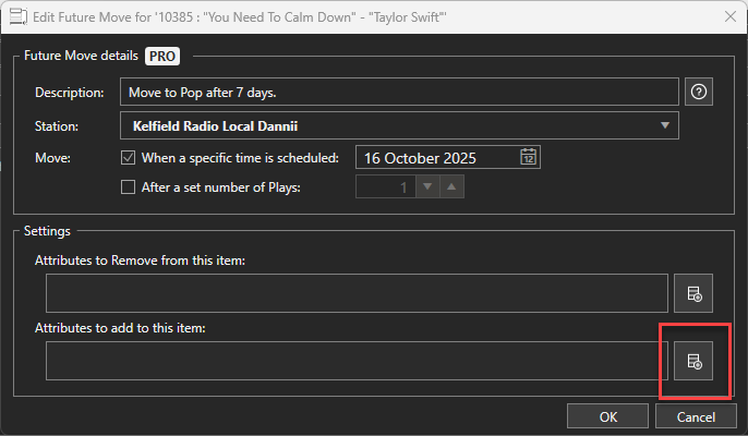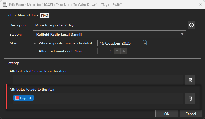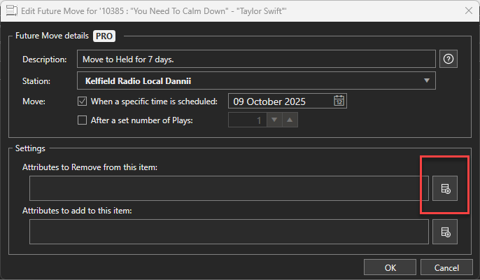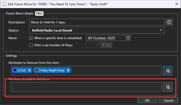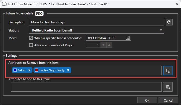 - If we wanted to Add any Attributes in this move, we would use the Attributes To Add section in the same manor. In this example, we want to prevent the Song from scheduling so we would leave this section empty.