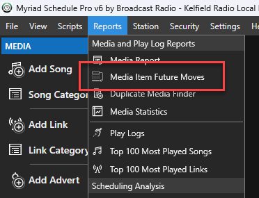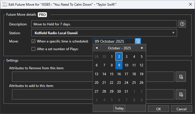 Future Moves is Myriad Schedule Pro feature that allows you to add or remove attributes from a Media Item at a future date, or after a certain number of times the item is scheduled.