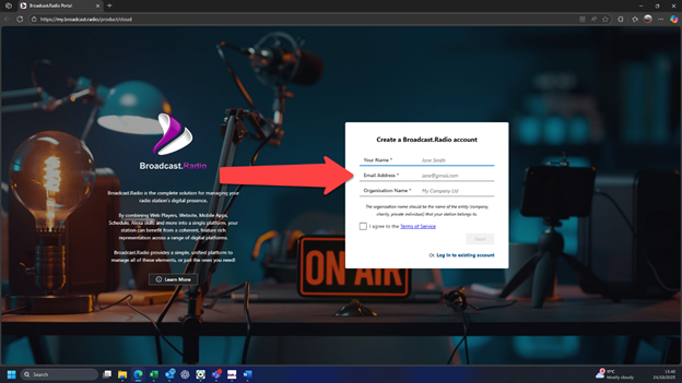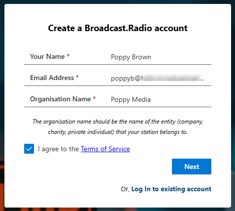 Add in your Name, Email Address and Organisation Name (or Station Name) then tick the Agree to Terms & Conditions option and click Next.
