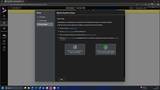 Finally choose whether you want to go straight to the Live Studio or select next steps from the Dashboard.