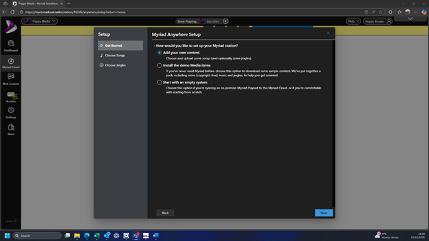As this is a brand new Myriad Cloud station, the 'first run experience' wizard will be displayed to help you get started.