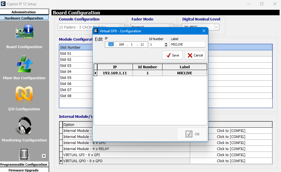 Now that you have a backup you can start by adding a Virtual GPO output connection to the IP address of the Hardware Service machine. This is done in the Hardware Configuration > Board Configuration section of the Setup Software. (See below)